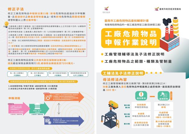 申辦單位 經濟發展局工業行政科 連絡資料 06-2991111#8241(永華市政中心)、06-6354648(民治市政中心) 申請資格 工廠負責人或受委託人 服務說明 工廠製造、加工或使用危險物品達管制量以上之次日起10日內,應至「工廠危險物品申報網」進行申報且應投保公共意外責任保險。 應備證件 詳相關連結 規 費 備 註 相關網站:經濟部工業局 連結位置 通話傳送即時簡訊加入 Skype您將需要 Skype 點數透過 Skype 免費為提供使用者有文書軟體選擇的權利,本文件為ODF開放文件格式,建議您安裝免費開源軟體(http://zh-tw.libreoffice.org/download/libreoffice-still/) 或以您慣用的軟體開啟文件。