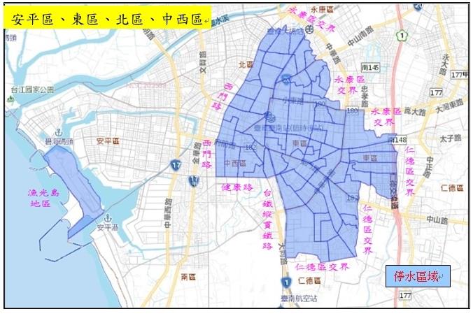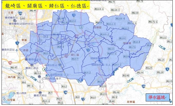 - 新市區:除大社里(國3以東)、潭頂里(國3以東)停水外,其餘里均壓降。