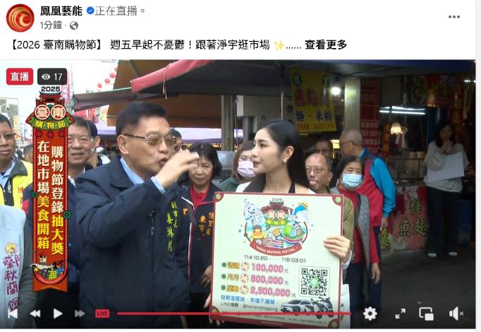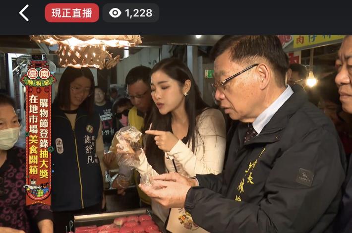 為搶在農曆年前帶動市場買氣、鼓勵民眾提前採買年貨,今(30)日上午於臺南佳里中山市場舉辦「臺南購物節-在地市場美食開箱直播活動」,邀請藝人楊淨宇實地走訪市場品嚐在地美食,並由副市長姜淋煌陪同導覽,透過直播方式提前為民眾開箱市場必吃美食與年節採買亮點,邀請大家年前多到市場走走,支持在地攤商。